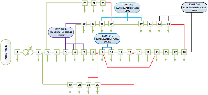 A large number of potential power plants planned for connection to the distribution network require significant strengthening and upgrading of the distribution network in order to increase the network hosting capacity. In situations where investments in the development of the distribution network do not follow the trends in the integration of distributed energy sources, the development of the RES sector stagnates, and any further connection usually requires significant intervention in the network, which can sometimes represent a significant financial burden for investors. Such circumstances are currently present at the level of the HOPS transmission network where, among other things, there are restrictions related to the possibility of connecting RES (primarily VE) due to congestion in the transmission network in certain specific operating states and extraordinary operating states that imply the unavailability of certain network elements. Explicit satisfaction of the N-1 criteria as a condition for connection to the network then leads to circumstances and expensive solutions that require the evacuation of energy into the 220 and 400 kV networks even for lower rated power plants. Similar trends in the medium-term period can be expected at the level of distribution networks, where more significant integration of FNE (at the level of MV and LV networks) and smaller VE is expected, and in a somewhat later period, electric vehicles. Analyzes of connection to the network usually do not take into account the flexibility of the distribution network, which is manifested through the topological flexibility of the network, the possibility of voltage control at the level of the feeder substation, regulation of reactive power using KB or other devices for regulating reactive power, management of consumption and storage of electricity, …. Also, such analyzes do not consider the possibility of limiting the placement of working energy from production units that are connected to the network in critical operating conditions. The implementation and active use of all the mentioned factors is necessary for a quick and efficient transition of distribution networks according to the concept of smart networks. By taking into account all the mentioned factors that are at the disposal of the DSO, the reception capacity of the network is significantly increased and the dynamics of construction and connection of power plants is accelerated. In this paper, he will provide a mathematical model for maximizing the connection capabilities of the network and determining the optimal solution for connection to the network, taking into account the aforementioned factors that define the flexibility of the distribution network. For this purpose, a model based on integer mathematical programming with second-order cone approximation will be presented. On the concrete example of the network, the limit possibilities of acceptance of RES into the existing distribution network will be examined, while considering the implementation of different sources of flexible management of the distribution network as well as different variants of connection to the network.